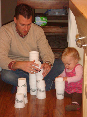 We DID venture out for a few hours to our friends' house (the Schroerings) for some Trivia Pursuit (and Mike had some business to do - that was the real reason for us getting out). Sunday we literally hunkered down inside all day. We played in cabinets (see pic of Iz and Mike playing with cups), explored the stairs (up and down and up and down), had several dance parties, and read countless books.